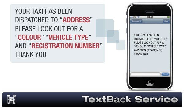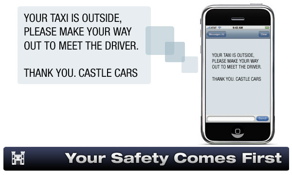 Castle cars offers a unique double text-back service, our text-back offers added security knowing exactly what vehicle to expect before it arrives especially when you are out at night in a busy area, Text Back greatly reduces the risk of you getting into the wrong taxi which improves your safety.